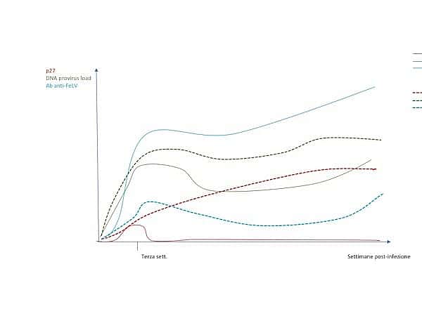In un interessante studio sperimentale(11) sono stati valutati p27, carico del provirus (copie per cellula) e Ab anti FeLV nell’arco di 15 settimane post-infezione su gatti con infezione regressiva e progressiva: nello schema esemplificativo si può vedere una chiara differenza nell’andamento di questi indicatori dell’infezione FeLV. L’infezione regressiva è caratterizzata da un titolo anticorpale significativamente maggiore che non nell’infezione progressiva e da una carica provirale inferiore a quella rilevata nell’infezione progressiva, oltre naturalmente al chiaro andamento del p27.